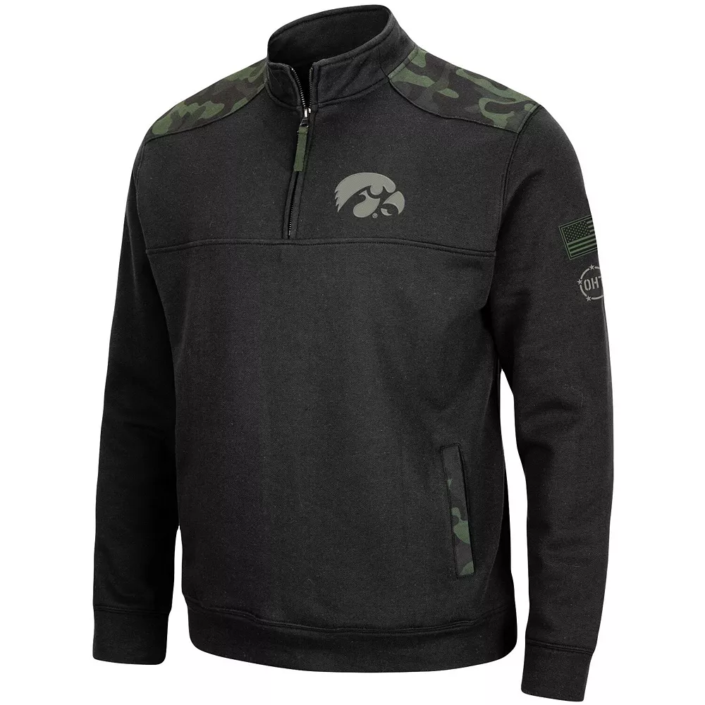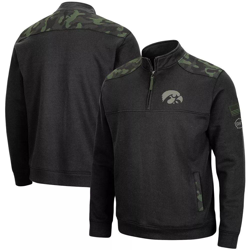 You love to show your Iowa Hawkeyes fandom and unmoving appreciation for military veterans. When the temperatures drop, reach for this OHT Military Appreciation Commo fleece quarter-zip from Colosseum. With its prominent camo pattern and crisp Iowa Hawkeyes graphics, you’ll be ready when the action on the field picks up and you’ll be supporting military veterans at the same time.