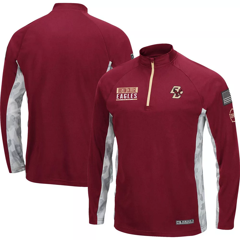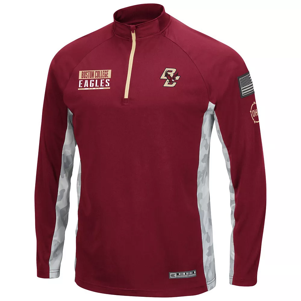 As a loyal Boston College Eagles member, ensure your game day gear is top-notch by sporting this Colosseum Operation Hat Trick Military Appreciation Snow Crusie quarter-zip. It features roomy raglan sleeves and a warm mock neck for extra coverage. Best of all, the signature Boston College Eagles design is complemented by camo paneling along the arms for a unique layering option.